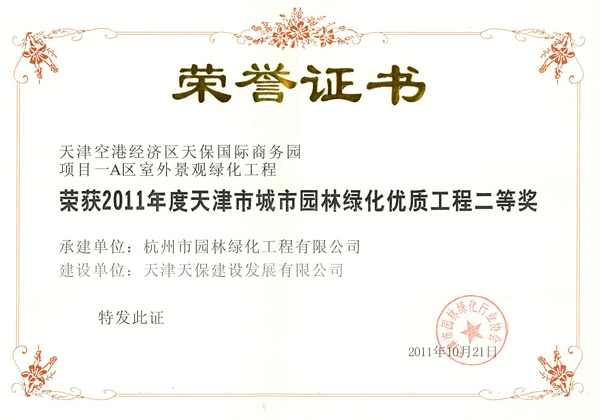 近日,由天津市园林绿化行业协会评选的“2011年度城市园林绿化优质工程”获奖项目正式公布,其中,由杭州市园林绿化工程有限公司负责施工的“天津空港经济区天保国际商务园项目—A区室外景观绿化工程”荣获“2011年度天津市城市园林绿化优质工程二等奖”。