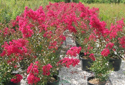 “红宝石”紫薇:株形矮小,萌蘖性强,耐修剪,花期长,花形紧凑,花色深似宝石,既可作盆栽观赏,又可作花境点缀。