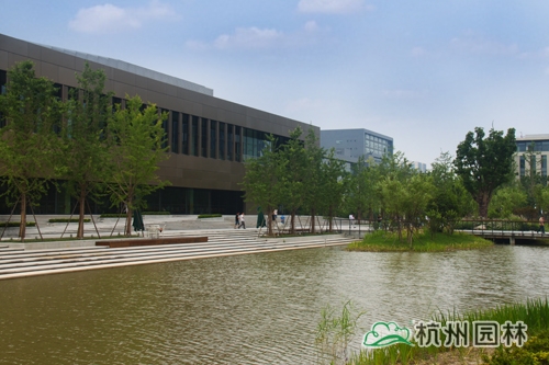 从滨江区江虹路的西入口处走进华为杭州生产基地,首先映入眼帘的是广场上大小不一的花池,一棵棵银杏、香樟、桂花生长得郁郁葱葱,昭示着无限的生机与活力。脚下的铺装,一边是菠萝格防腐木,一边是规则的花岗岩,一“软”一“硬”,相映成趣,蜿蜒延伸,直通前方的人工湖。清澈的湖水,在夏日阳光的照耀下,波光粼粼,偶尔一阵风来,一圈圈的涟漪荡漾,整个湖面都动了起来,让人忍不住加快脚步,去一睹前方的美景。这就是华为杭州二期生产基地景观绿化分包工程一标段的现场景观,该工程由彩神手机官方网站承建,曾荣获2013年度浙江省园林绿化工程安全文明施工标化工地。