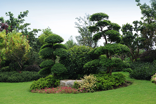 在项目主入口、次入口、中心景观及一些重要景观节点,黑松、女贞、水蜡、五针松、红花檵木、紫薇等造型树木,宛如万绿丛中的一点“红”,彰显出独特的气韵与品味,起到画龙点晴的效果。