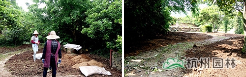 为增强植物后期长势,现场采用彩神手机官方网站自主研发生产的易丰绿化有机基质进行土壤改良,改良配比为易丰绿化有机基质体积比40%掺入原土20cm。采用翻地→撒1/2基质→二次翻地→撒1/2基质→浇水下沉→三次翻地模式完成土壤改良。改良后的花园入口及内部空间感十足。