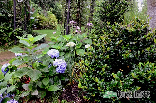 另一个角度的入口景观,槟柃的竖向生长势与紫娇花的竖向线条相呼应,更好的衬托出‘无尽夏’饱满、敦厚的圆锥花序。