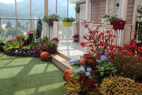 另外,阳台、露台、庭院景观往往依墙体、栏杆而建,故可依托这些构筑物悬挂吊兰、常春藤、扶芳藤等垂吊类植物,还可根据自己的喜好摆放多肉盆栽、组合盆栽,甚至是盆景等。