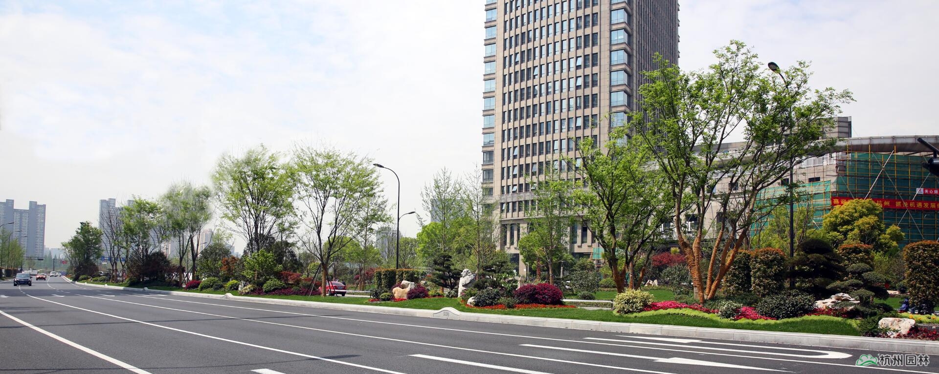 新塘路的植物选择在确保品种丰富、色彩多变的基础上,大量选用冠型饱满、枝条健壮、色彩鲜明的乡土树种。行道树以香樟为主,枝叶茂密而秀丽,遮荫良好;机非隔离带以银杏为主,树冠浓密,树干通直,树形美观,是优良的观赏树;中央隔离带以朴树、樱花、红花檵木球、红枫及造型罗汉松为主,营造出浓郁的杭州特色。
