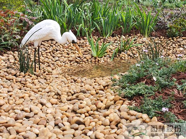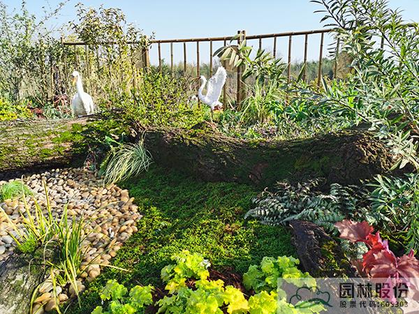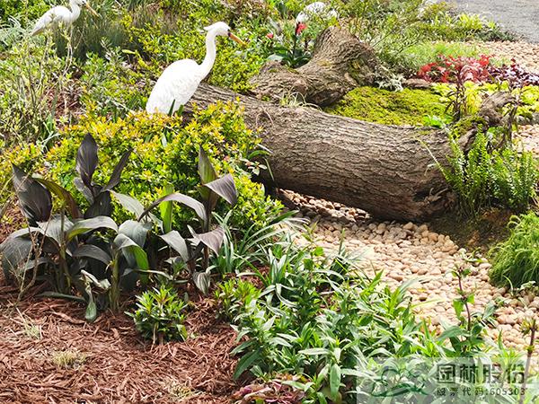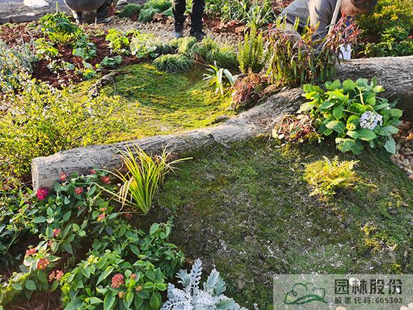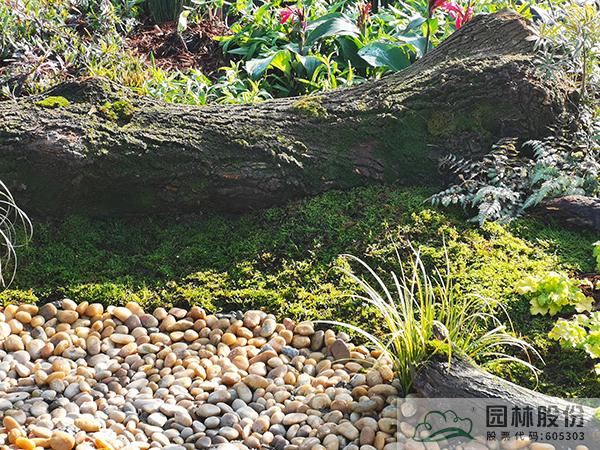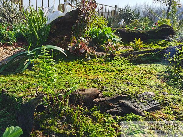 ①模拟苔藓植物的生境条件,将藓类湿地景观与枯木结合,在枯木与卵石道路交叉部位布设小水塘,保持苔藓生长环境土壤湿度。