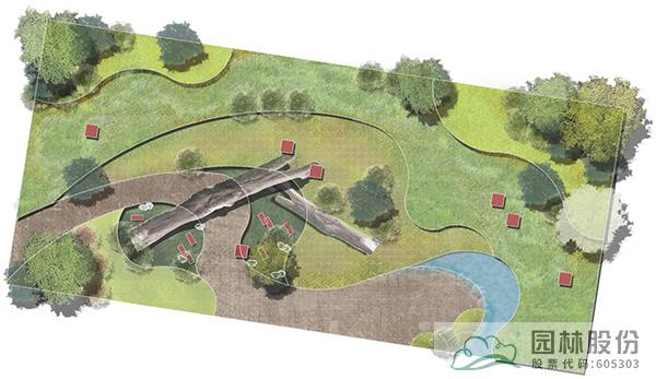 以枯木为主景,种植大灰藓、细叶小羽藓等藓类植物,搭配枝条飘逸的河滩冬青,水波粼粼的浅水塘,打造生态且富有趣味的苔藓湿地景观,周边小范围种植花灌木及宿根花卉,增添色彩。