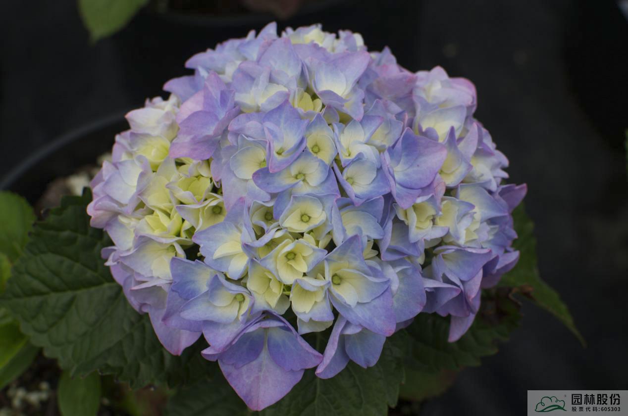 叶片呈卵形,中绿色;扁球状花,萼片(花瓣)较大,初开时花瓣为亮黄绿色,随后会慢慢变为红紫、粉蓝等。盛花期,其花瓣层层叠叠,绚丽多彩,明媚动人。杭州5月上旬开花,可延续至6月下旬。