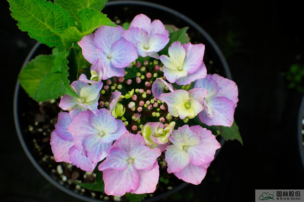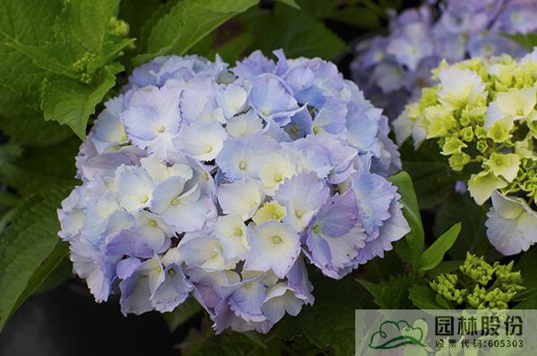 大叶绣球品种间杂交品种;叶片卵形,中绿色;盘状花,萼片(花瓣)巨大,花色为深紫粉色至鲜紫蓝色,添加调蓝剂时可变为深紫蓝色。花开时,宛如一只只蝴蝶在枝头翩跹,灵动多姿。杭州5月上旬开花,可延续至6月下旬。