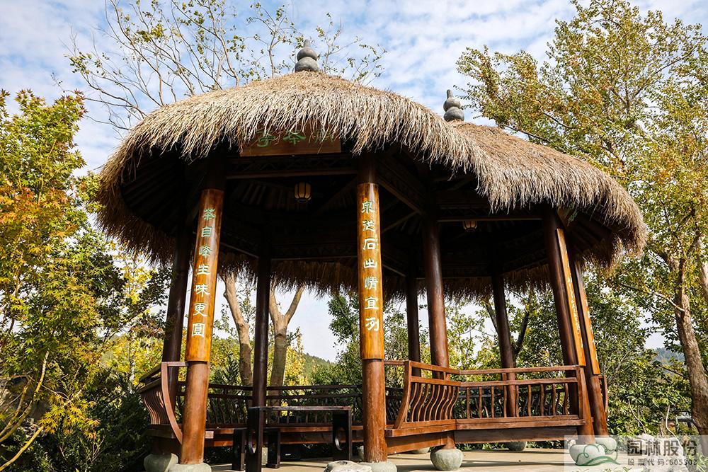 契合展区主题的樾香亭临湖而立,双坡屋面,八柱敞亭,柱子上书五言联“鱼乐人亦乐,泉清心共清”,尽显悠闲舒适的情趣。在亭内凭栏而坐,侧耳听风雨,迎风嗅花香。抬头远望,荷叶亭亭的水面上,有鱼儿在水中嬉戏;曲折的长桥上,游人在漫步观景;水岸边,银杏、三角枫、乌桕等色彩缤纷,编织出一幅深秋的美丽画卷。