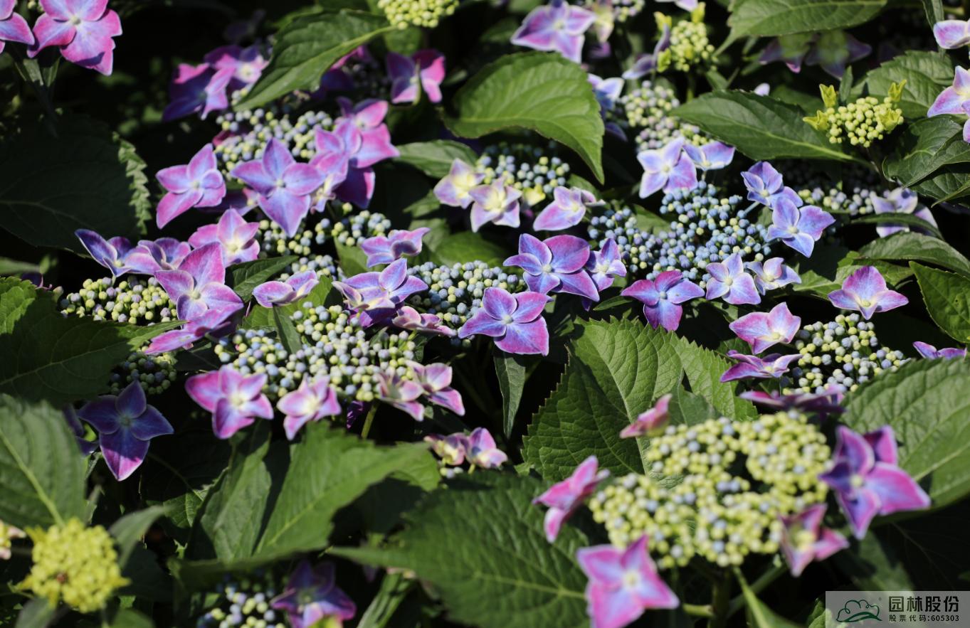 大叶绣球‘梦幻星空’:伞房状聚伞花序盘状,高度2~4cm,直径10~12cm,上海及杭州5月中下旬开花,可延续至6月下旬;可孕花花瓣蓝色;不孕花萼片先端白色至浅蓝色中部蓝色至紫色基部白色;花色梦幻,花型飘逸,适合家庭园艺和工程。