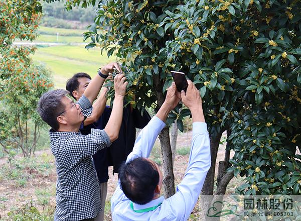 10月14日下午,参会代表参观考察了杭州彩神(中国)国家桂花种质资源库。资源库里,近百种桂花正值盛花期,奶白色的银桂和四季桂、金灿灿的金桂,橙黄色的丹桂,竞相开放,甜甜的桂花香弥漫在空气中,串串花序挂满枝头,吸引参会代表们纷纷驻足交谈拍照。