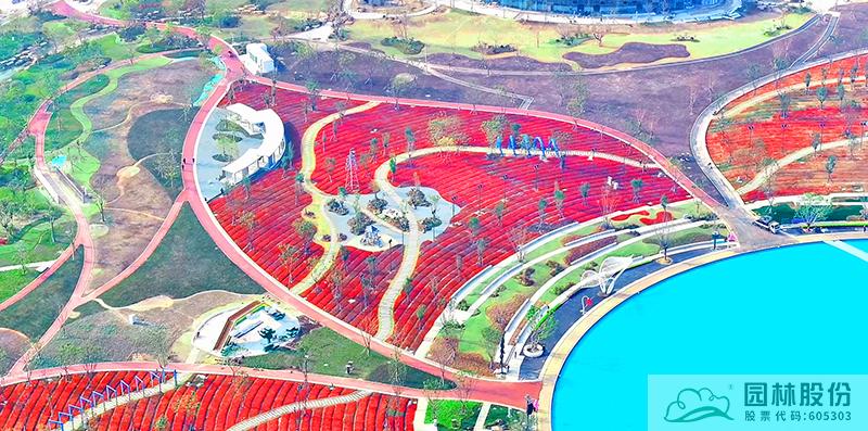 位于项目中心的天空花湖占地面积约27万平方米,以水环、外环及花瓣环作为构成花海的主要结构体系,溪水环绕花海外围形成花溪景观。水环:即天空之镜,由一片圆形浅水水面作为花海的核心区域,天水一色,行人在其上犹如在大型的镜面游走。花瓣环:作为花海的主要元素“花瓣”,以有“英雄花”之称的火星花作为主要片植品种,同时采用多种观赏性花卉,如紫绒鼠尾草、矮生马鞭草、郁金香、三角梅、粉黛乱子草等花带打造充满活力的花海景观。外环:围绕“飘落的花瓣”设计主题甄选花卉品种,采用相同花期的红粉色为主的多年生花卉片植方式,渲染烘托中心花海的热烈气氛,以绿色草坪作为衬托花海的底色,引导游人近距离打卡观赏。