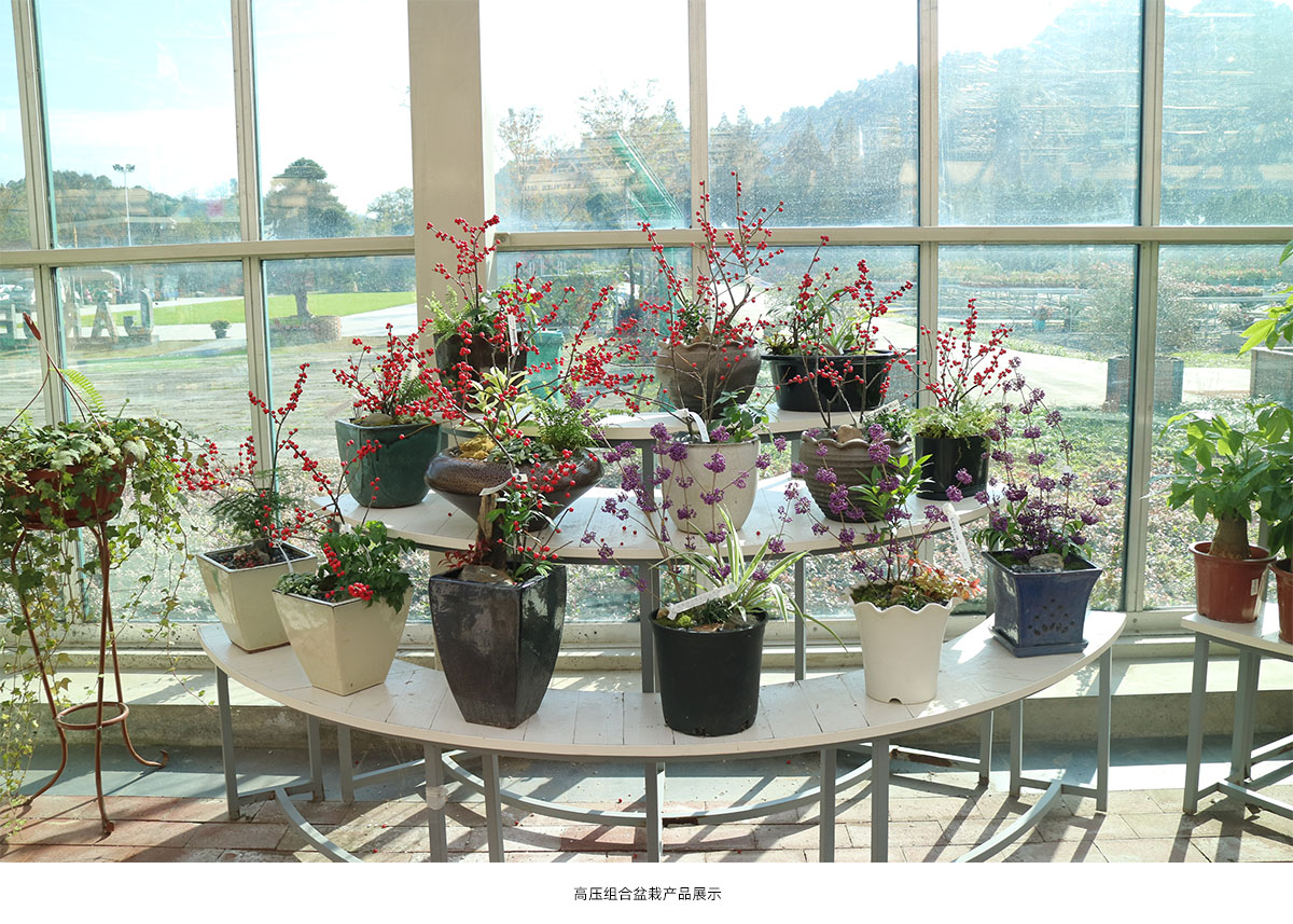 以容器育苗技术为基础,结合株型控制技术、高空压条技术和花期调控技术,对上百种园林植物进行深度开发,实现中大型植物小型化和多季开花的目的,有效提高了植物产品的附加值。 (1)容器育苗